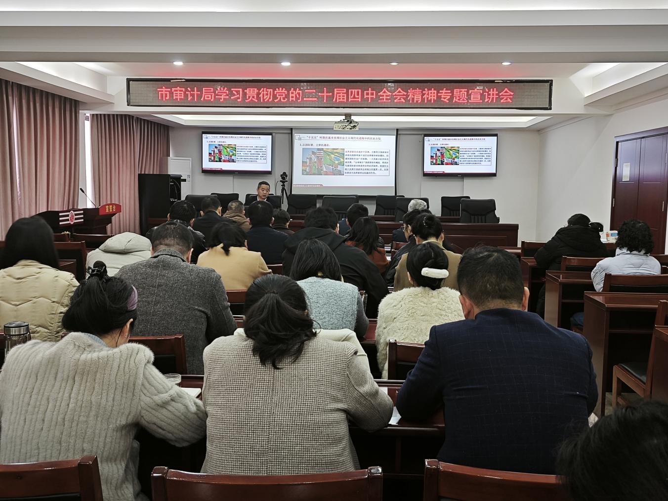为精准把握党的二十届四中全会精神核心要义,切实将思想和行动统一到党中央决策部署上来,以高质量审计监督护航地方经济社会高质量发展,2025年12月11日上午,咸宁市审计局邀请市宣讲团成员、咸宁职业技术学院马克思主义学院书记兼院长龚斌安同志,开展学习贯彻党的二十届四中全会精神专题宣讲活动,全局干部职工参加。